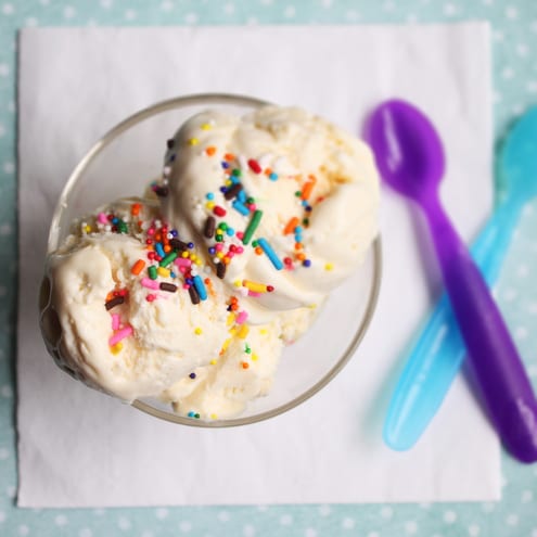 - Optional: stir in chunks of frosted funfetti cake once the cake reaches a frozen yogurt consistency and mix a little bit more before freezing into ice cream.