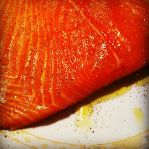 - Season the salmon with salt and cracked black pepper, then rub with olive oil.