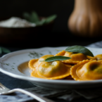 Delicate pumpkin ravioli, homemade from scratch, tossed in a nutty brown butter sage sauce. Comfort food perfection!
