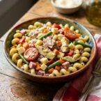 Roasted peppers, diced ham, marinated artichokes, Italian tuna, and good olive oil all go into this. The salad gets better as it sits, so you can make it ahead. Good for beach picnics or when you need to bring something to a party.