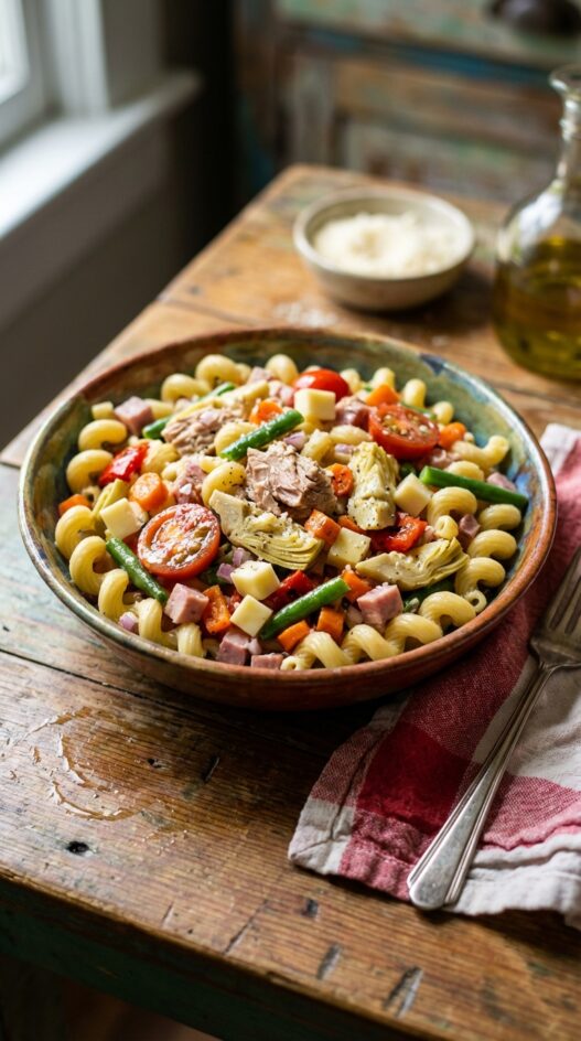 Short pasta shapes like fusilli or penne are ideal, as they hold the vinaigrette and mix-ins well.