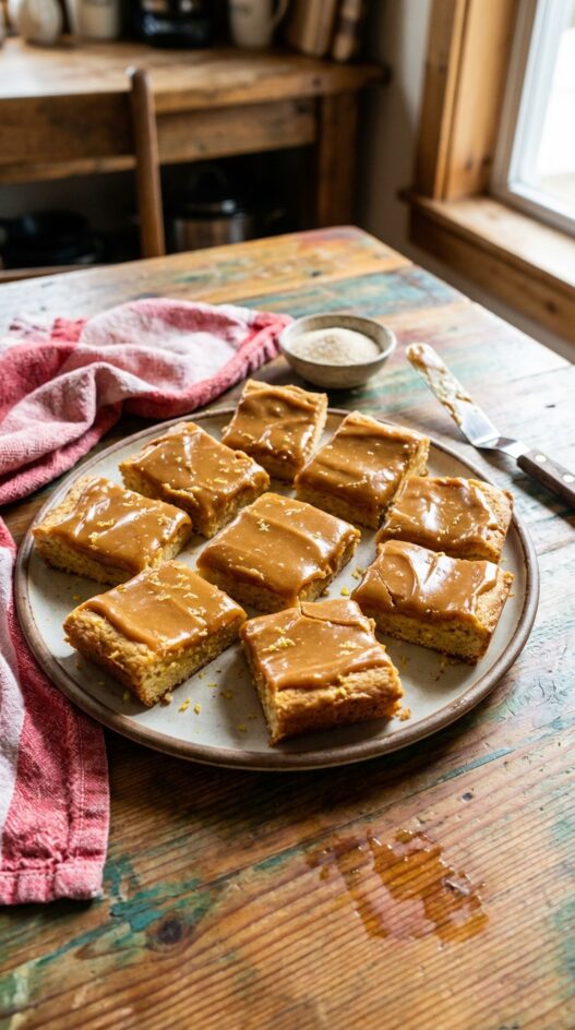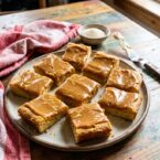 The lemon sugar cookie base can be baked the day before and stored covered at room temperature. Add the caramel frosting the next day so it stays smooth and fresh looking.