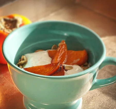 Caramelized persimmons paired with vanilla-infused Greek yogurt and crunchy pumpkin seeds make for a delightful, low-fat breakfast or dessert.