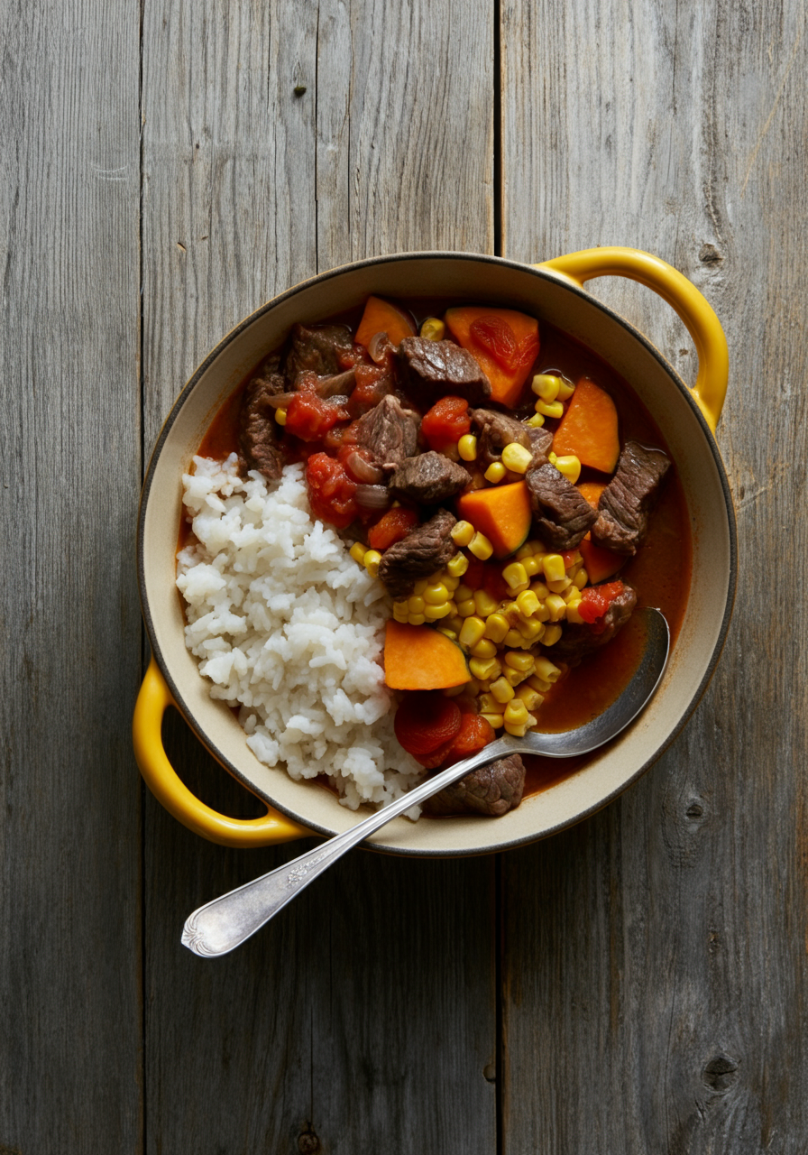 Carbonada Criolla is a hearty beef stew from the Patagonia region of Argentina. It combines beef with sweet elements like dried fruit and corn, cooked low and slow until the meat is tender and the broth is rich.