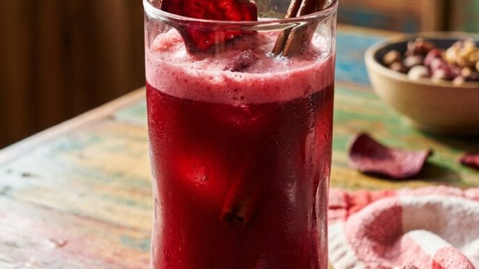 Remolacha Reposado Cocktail Reposado tequila shaken with beet juice reduction, lime, and cinnamon, topped with sparkling water. Deep red, earthy, warm-spiced. byHonest Cooking0