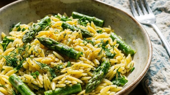 Asparagus and Lemon Orzo Orzo cooked in chicken stock with turmeric, tossed with blanched asparagus, lemon juice, olive oil, garlic, Dijon mustard, and fresh herbs. Served warm or cold. byDanelle MC6