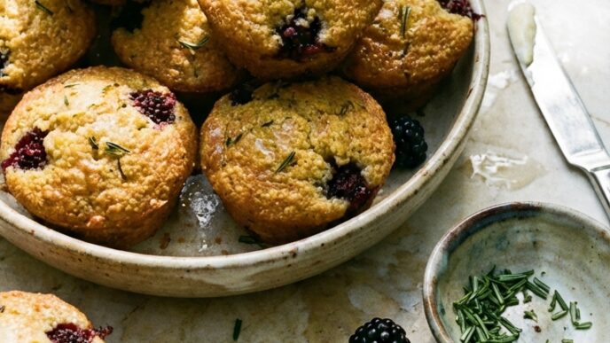 Blackberry Rosemary Corn Muffins Corn muffins with rosemary-infused butter, chopped rosemary, blackberries, and cornmeal flour. The rosemary is piney and warm behind the sweet-tart berries and grainy cornmeal. byKathy Gori6