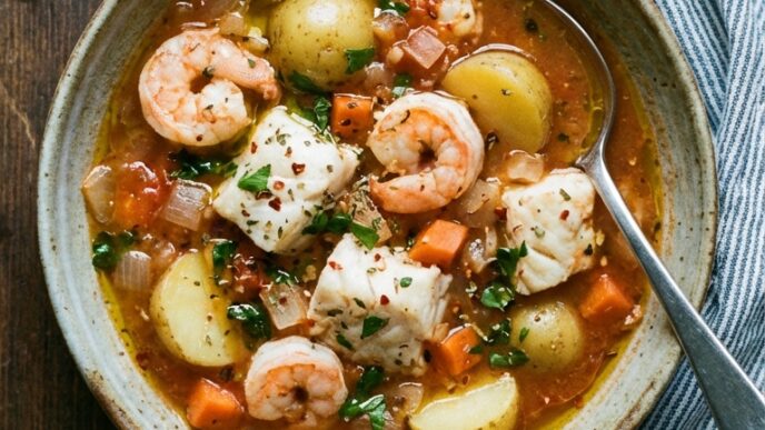 Hearty Potato and Seafood Stew There's nothing quite like the marriage of creamy potatoes and fresh seafood to chase away an evening chill. And this potato and seafood stew is the ultimate union of these two comforting flavors. byLaney Schwartz7