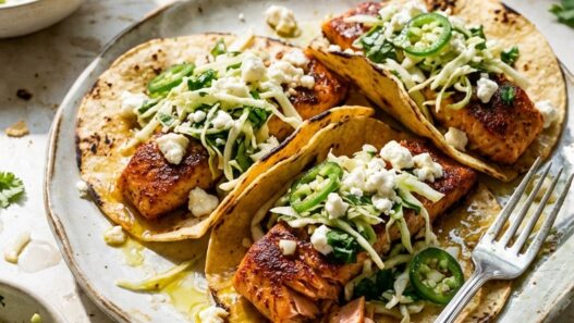 Spiced Salmon Tacos with Cilantro and Jalapeño Slaw Salmon fillets rubbed with chili powder and cumin, baked, and served in corn tortillas with a cilantro-jalapeno-lime cabbage slaw and crumbled goat cheese. byKelli Lyn0