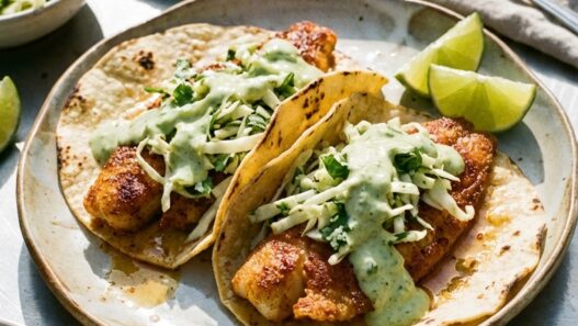 Crispy Fish Tacos with Avocado Sauce and Cilantro Slaw Crispy tilapia tacos seasoned with ancho chile powder, topped with blended avocado sauce, shredded cabbage, and cilantro in warm corn tortillas. byTara Noland4