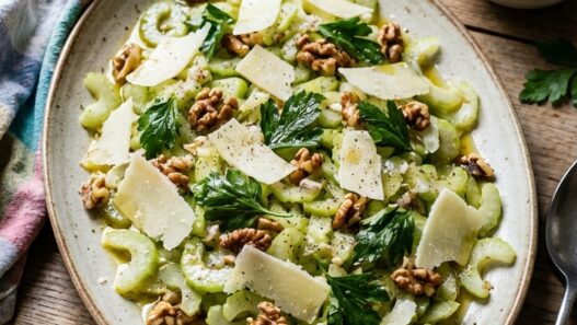 Celery and Parmesan Salad A celery salad made with thinly sliced celery hearts, shaved Parmesan, and toasted walnuts. Dressed with olive oil, lemon, shallots, celery seed, and anchovy paste. byHonest Cooking3
