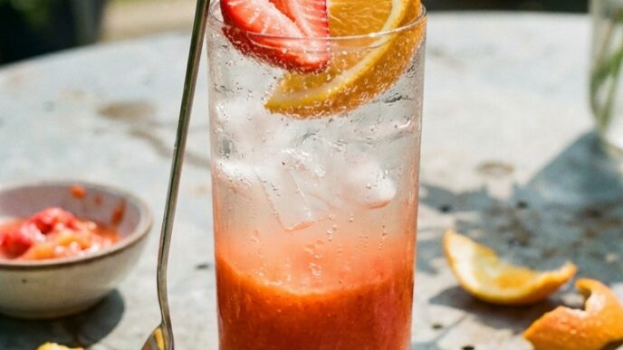 Orange-Strawberry Spritzer Fresh strawberries blended with orange juice, strained through a fine mesh sieve, and topped with sparkling water over ice. A five-ingredient summer spritzer. byPriya Lakshminarayan4
