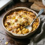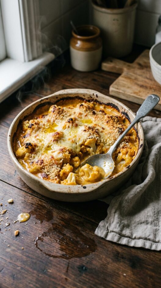 Roasted cauliflower and pumpkin mingle in a creamy cheese sauce, baked to golden perfection. A comforting, flavorful vegetarian main.