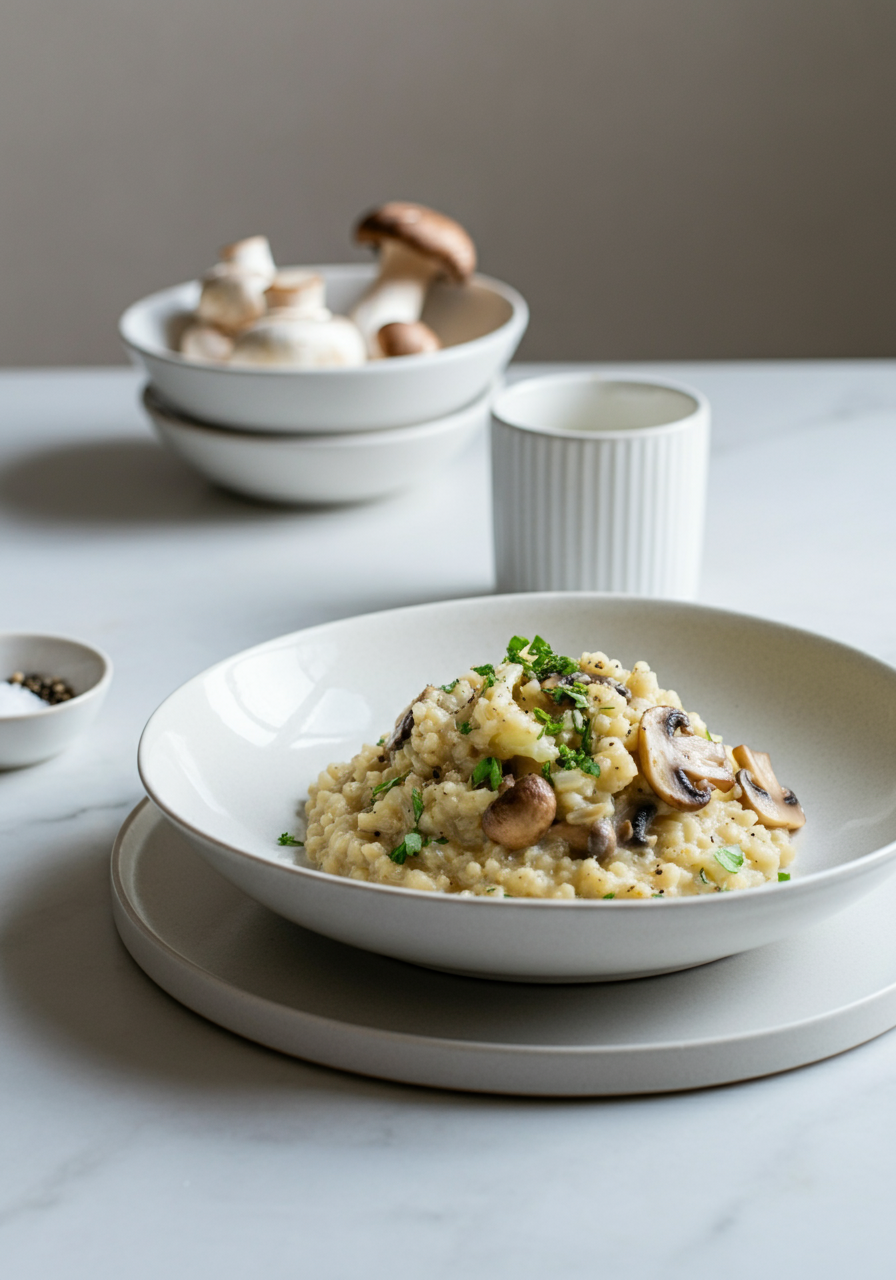 Cauliflower risotto has a credibility problem. Every version I’ve tried in restaurants is either watery or so aggressively seasoned you can’t tell what you’re eating. This one avoids both. The cauliflower gets riced finely and cooked down in broth until it’s genuinely creamy, not just soft and wet. The porcini mushrooms go in roasted, not raw, which keeps them from turning the whole dish into a soggy mess. White wine vinegar at the end cuts through the starch and makes it taste finished. It’s not a perfect substitute for arborio risotto and I wouldn’t claim otherwise. But as a lighter, faster dinner that doesn’t leave you half-asleep by 8pm, it does the job.