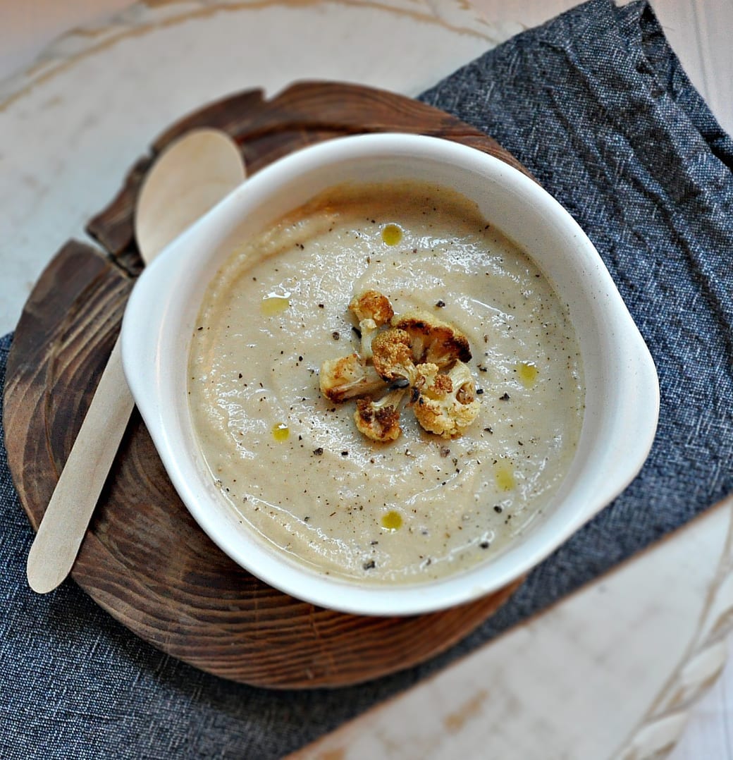 This creamy cauliflower soup is roasted to perfection and blended with chicken stock and milk for a comforting and flavorful dish.
