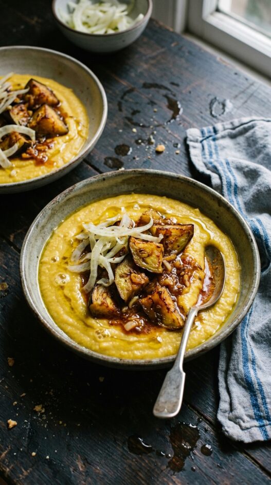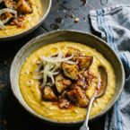 Just look at this yellow bowl of sunshine! It’s a silky-smooth, comforting dish with spicy eggplant to bring it all together beautifully. Check out the recipe below!