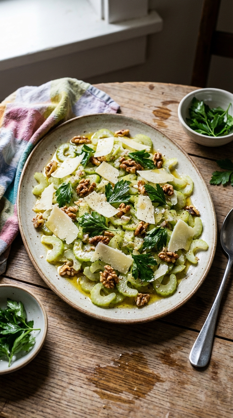 This vibrant salad celebrates celery with a zesty lemon-anchovy dressing and crunchy walnuts. A perfect side for any occasion.