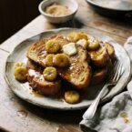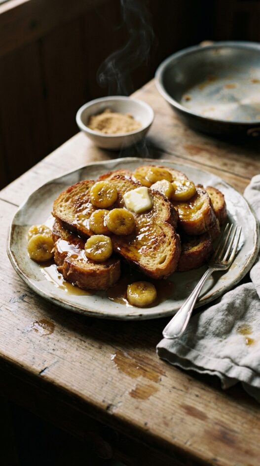 - Serve warm French toast with real maple syrup and caramelized bananas.
