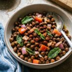 Channa zor garam is Indian street food built on black chickpeas that get flattened and fried until crispy, then hit with chaat masala and lemon. Street vendors sell it in paper cones and you eat it standing up. This home version skips the deep frying but keeps the essential technique: flatten the chickpeas before sautéing so they crisp up on the flat edges. Soaking overnight is essential; dried black chickpeas won’t cook through in any reasonable time without it. Have everything prepped before you start cooking because this moves fast. Chaat masala is sold at any Indian grocery store and is worth having on hand; there’s no clean substitute.