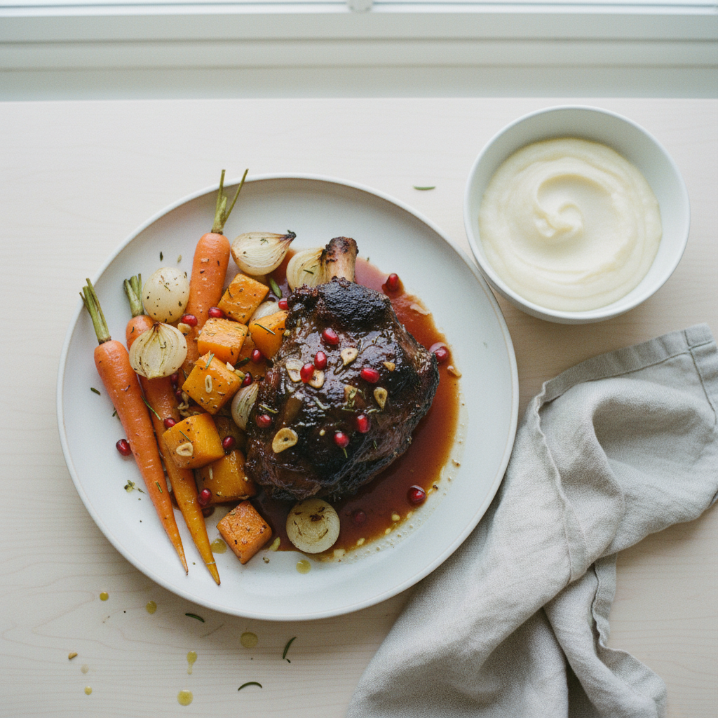 Hearty winter vegetables and succulent boar meet in this satisfying dish. A light celeriac puree and pomegranate seeds add a fresh touch.
