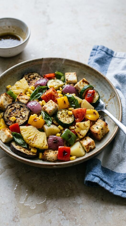 A neighbor had a wood-fired grill and very strong opinions about what went on it. Most of the time it was meat, but one August afternoon she dragged out every vegetable in the crisper, threw it all on the grate, and served it with sliced paneer and balsamic. I’ve been making versions of that salad ever since. Char grilled vegetables taste genuinely different from roasted ones. Smokier, slightly bitter at the edges, and of getting the heat high enough to mark them properly.