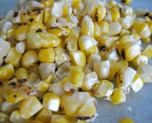 - Husk the corn, ensuring that you remove all of the silks. Place the corn over your gas burners on low heat. Keep an eye on the corn and use tongs to turn the corn every so often, ensuring an even char. Once evenly charred, use a serrated knife to cut the kernels from the cob.