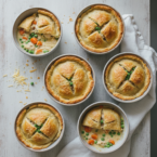 - Divide filling into 6 individual bowls or a 9×13 baking dish. Top with crust, trim excess, and cut slits in the top. Brush with egg wash, if desired.