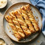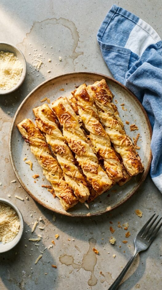 The recipe for these bread twists is easy to make: we’re simply brushing puff pastry dough with an egg wash and sprinkling with Parmesan, then baking.