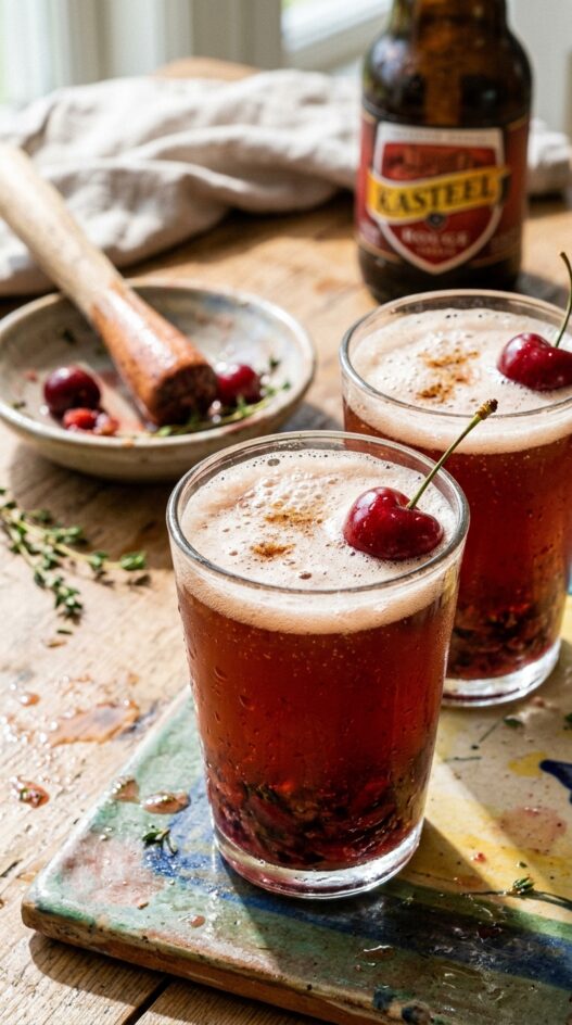 Kasteel Rouge Amber is recommended because it already contains cherry liqueur, which deepens the cherry flavor in the cocktail. A good substitute is any Belgian amber or dubbel — Chimay Red or Leffe Brune both work well. A regular fruit beer will produce a lighter, less complex result, but is still enjoyable.