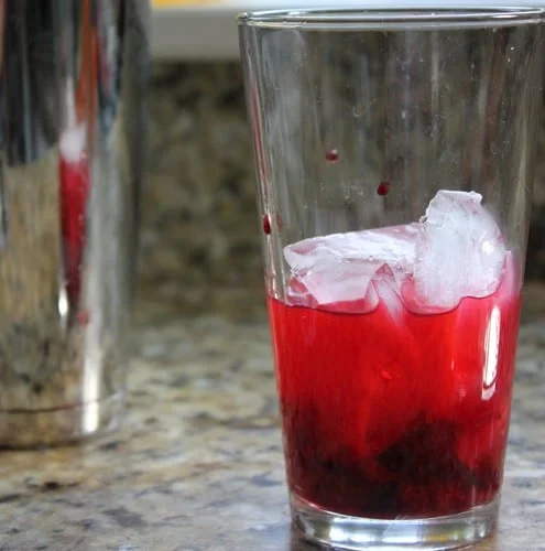 - Muddle 3 of the cherries and the sugar in the bottom of a cocktail shaker.