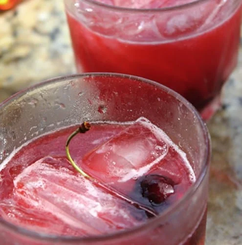 - Strain into a cocktail glass with a few cubes of ice. Add the splash of soda and stir gently. Drop in the last cherry as a garnish, and serve.