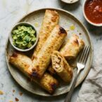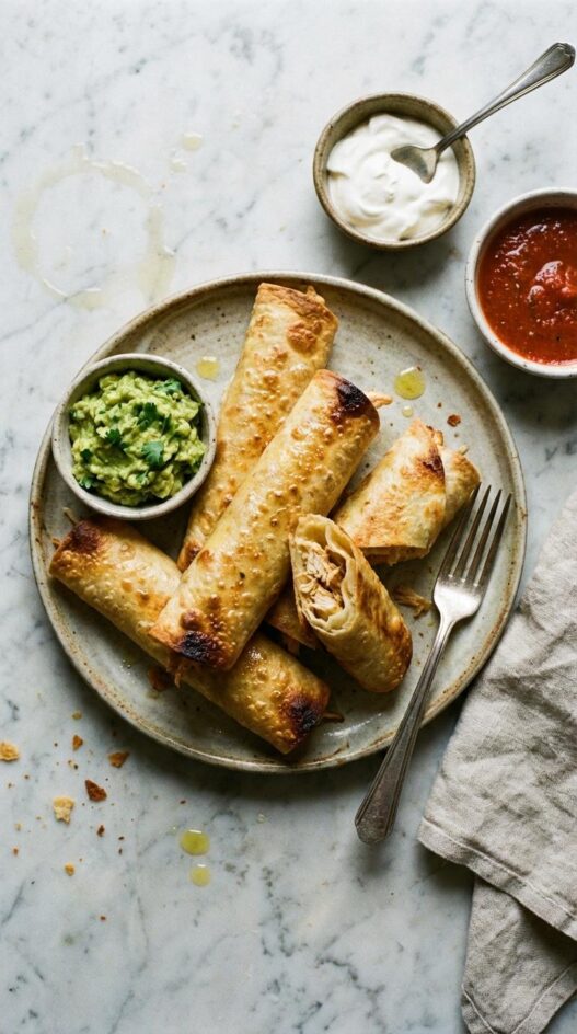 Flautas are the sort of recipe that look like they are a massive project but are actually very direct. Seasoned shredded chicken and cheese rolled up in flour tortillas and fried until shatteringly crisp. The whole batch takes about 30 minutes, and most of that is the rolling. They work for game day, a casual dinner with friends, or a weeknight when you want something your family will actually get excited about. The cream cheese in the filling is not traditional, but it solves a real problem. It binds the shredded chicken together so the filling does not fall apart when you bite into the flauta.