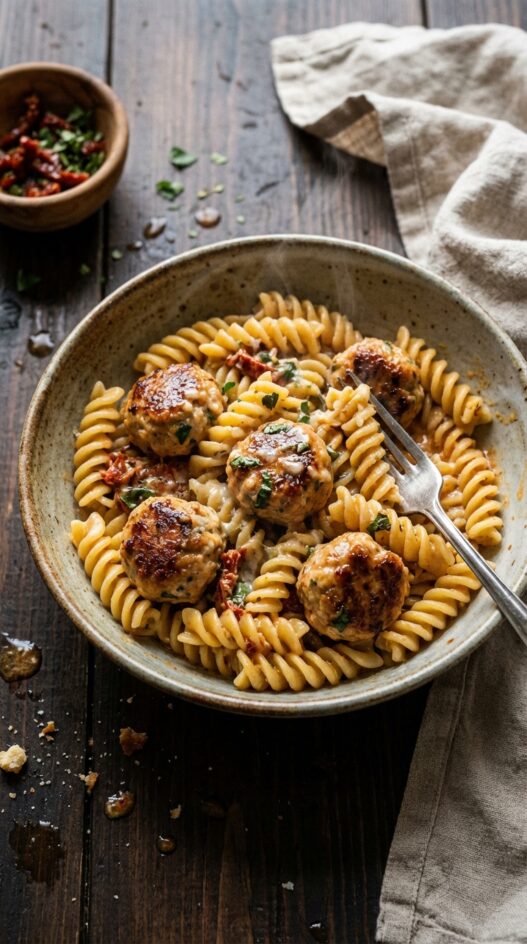 Tender chicken meatballs in a creamy sun-dried tomato sauce tossed with fusilli pasta. A quick, satisfying weeknight meal.