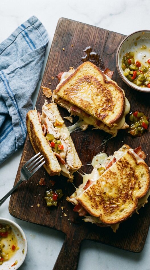 A twist on the classic Monte Cristo, this savory sandwich features crispy bacon, melty Swiss, and juicy chicken. Perfect for brunch or a quick weeknight meal!