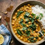 This is the weeknight curry that lives in your pantry — canned chickpeas, canned tomatoes, a bag of spinach, and a handful of spices you probably already own. It comes together in 30 minutes with no special technique and produces a rich, creamy, deeply spiced bowl that tastes like it simmered for hours. The chickpeas hold their shape while soaking up the sauce, and the spinach wilts in at the end to keep its color.