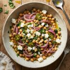 Most chickpea salads feel like an afterthought. Open a can, dump, dress. This one earns its place on the table because you cook the chickpeas from dried and build flavor in layers. The onion goes into olive oil until it softens into something sweet and translucent. Garlic and jalapeno follow. The warm chickpeas meet that mixture while everything is still hot, and the feta crumbles and half-melts through it all.