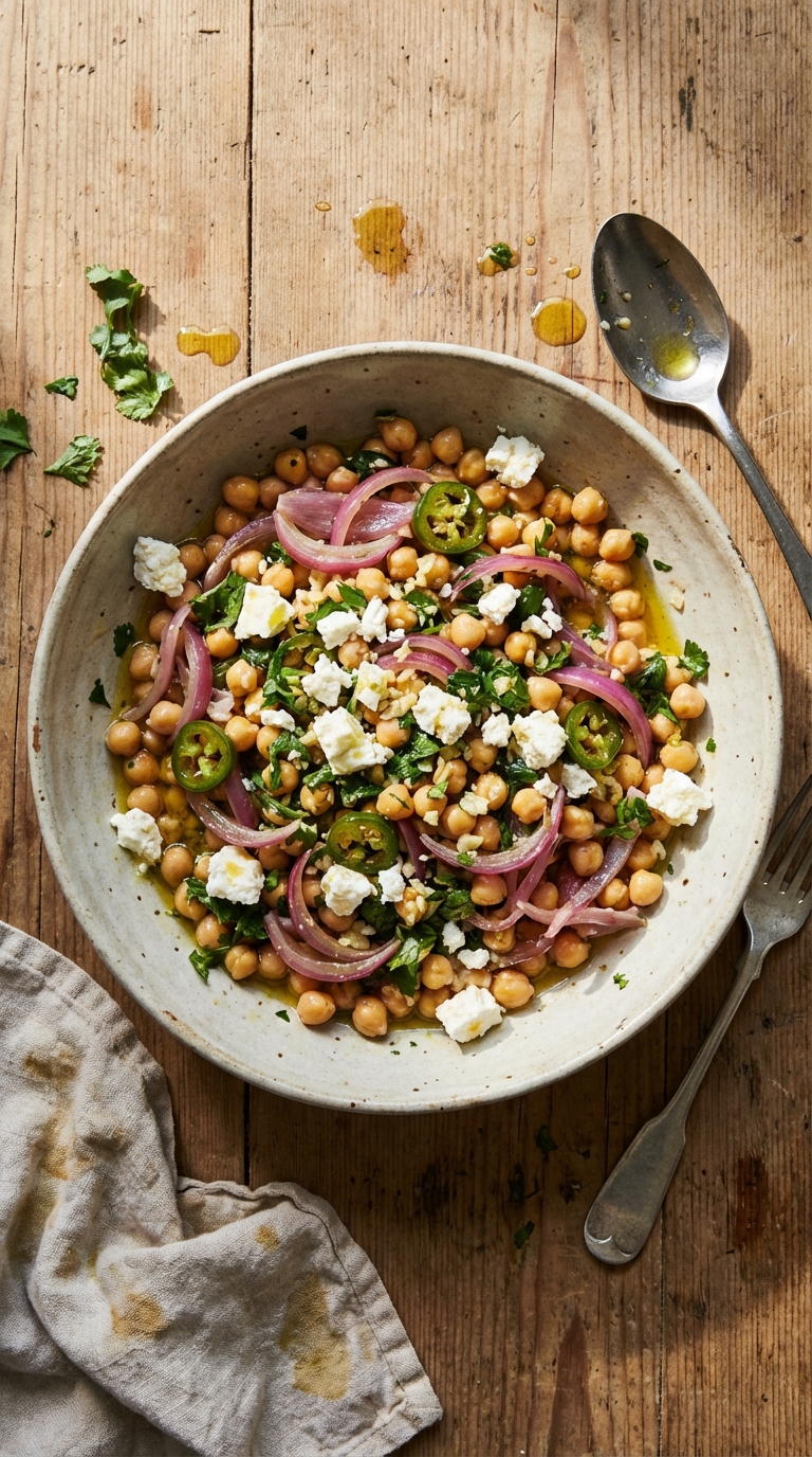 A vibrant, flavorful chickpea salad perfect for a light lunch or a satisfying side. Feta, cilantro, and jalapeño add a delightful zing.