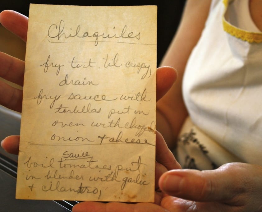 During a recent discussion about this, Gilda remembered that she had written down my mother’s recipe for chilaquiles while my mother dictated it to her over the phone when they were teenagers. Gilda dug around her box of recipes and found the original. Written in pencil and the page now yellowed, the instructions are vague and fail to settle the question of whether chilaquiles and migas are different interpretations of the same dish.