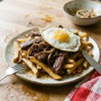 - Layer fries on a plate, top with steak and onions, and then place a fried egg on top.