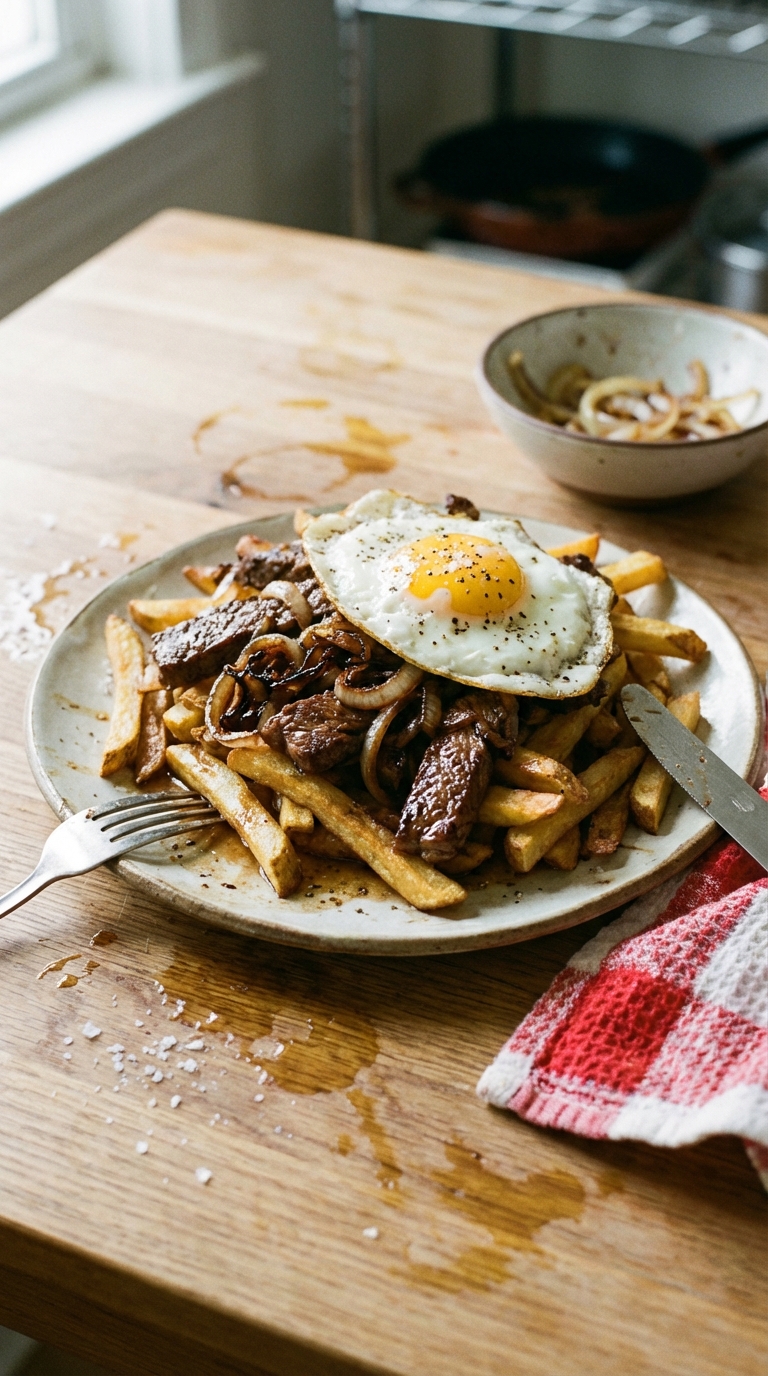 - Combine Ingredients on Plate: Arrange the crispy fries on a large serving platter or individual plates. Top with caramelized onions, steak strips, and place the fried eggs over the top.