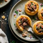 A vol-au-vent is a hollow puff pastry case that holds a savory filling. You can buy frozen puff pastry shells or cut rounds from puff pastry sheets, scoring an inner circle that puffs up and gets removed to create the cavity.