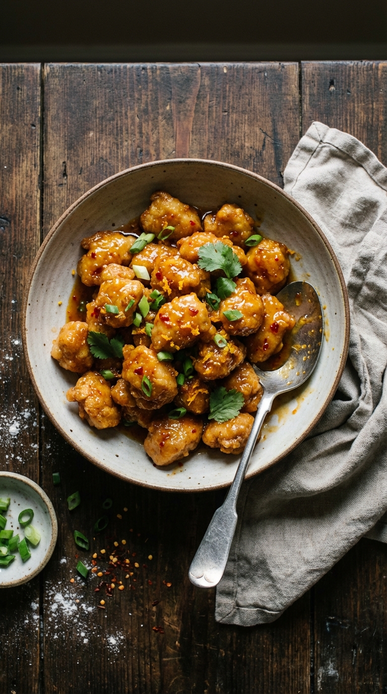The coating is cornstarch and flour mixed with salt, nothing else. Cornstarch gives you shatter, flour adds structure. Dip the chicken in beaten egg first, then the dry mix. For extra crunch, go through both steps twice. The double dip creates layers that hold up under sauce without getting soggy.