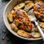 - Add chicken to the bowl. Turn multiple times to coat the chicken. Place the chicken in the center of the baking dish and arrange the potatoes around it.