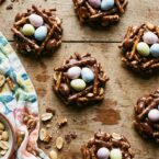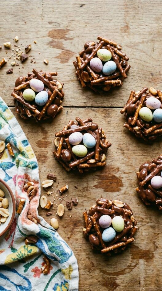 These adorable bird’s nest cookies combine chocolate-covered pretzels and peanuts with peanut butter M&Ms for a delightful Easter treat.