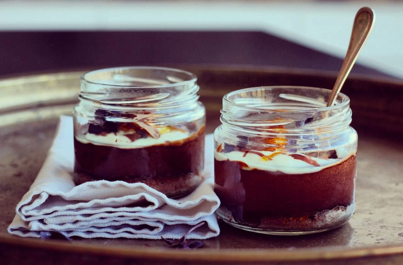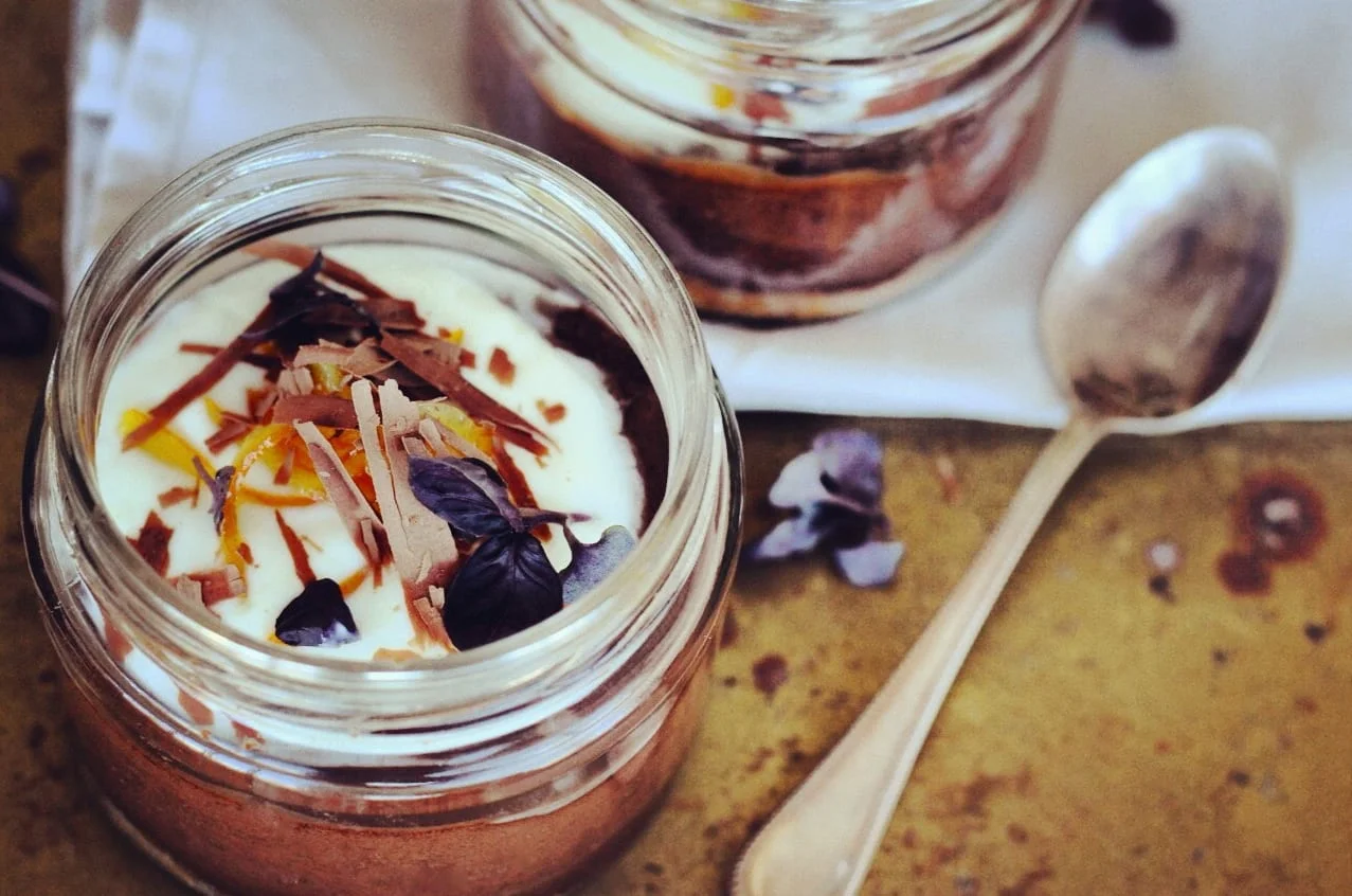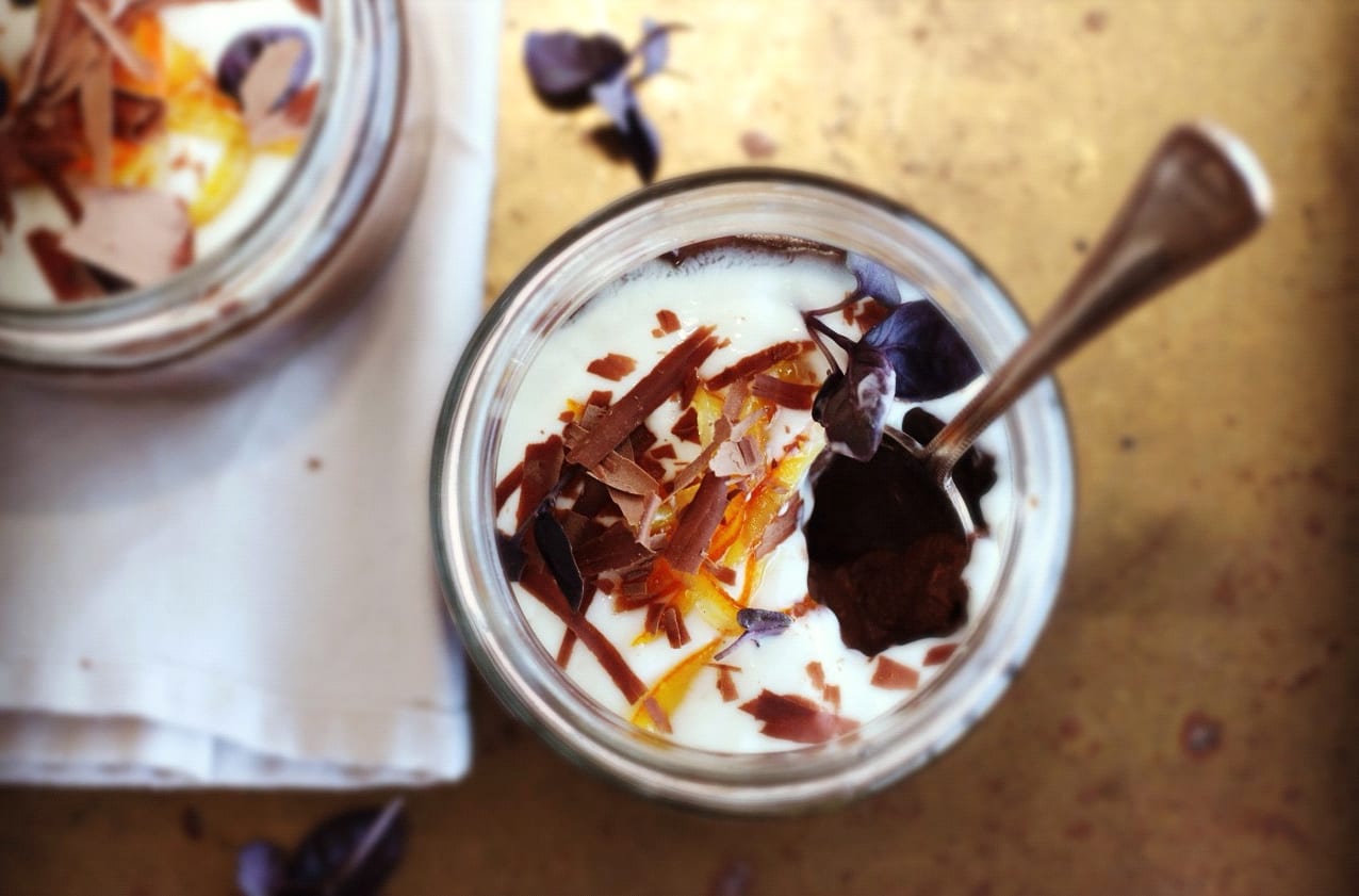 Baked Silken Chocolate Jam Jar Cheesecakes with Vanilla Yoghurt & Candied Orange
