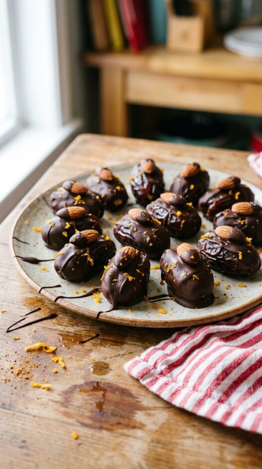A friend brought these to a holiday gathering without telling anyone what they were. Big difference. Gone in eight minutes, no exaggeration. Medjool dates stuffed with spiced almonds and dipped in bittersweet chocolate sounds fussy, but the whole process takes about thirty minutes and most of that is waiting for the chocolate to set. The orange peel and cinnamon in the almond coating are what lift this from a simple snack into something you’d actually serve at a party. No baking, no special equipment, just a microwave, a baking sheet, and some patience with the setting step. They keep well in the fridge for four or five days, which almost never matters because they disappear faster than that.
