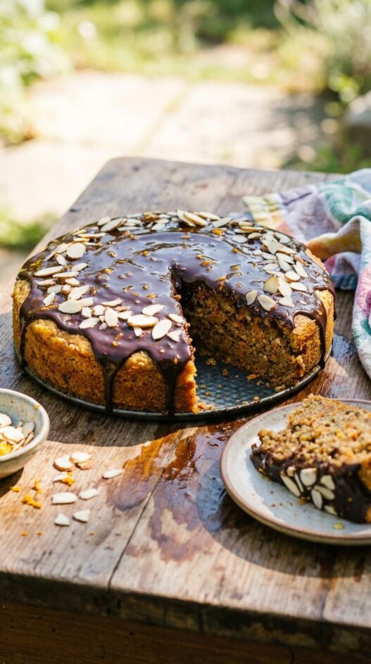 Most carrot cakes lean on wheat flour and cream cheese. This one skips both. Ground pistachios and almonds do the structural work here, with brown rice flour holding things together, and the result is a cake that tastes like nuts and carrots first, flour second. It’s Italian in approach. No frosting. Just a thin dark chocolate glaze with orange zest cracked over the top.