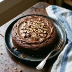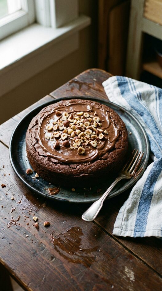- Gently warm the chocolate hazelnut spread until spreadable. Spread on the cake and sprinkle with the remaining chopped hazelnuts.