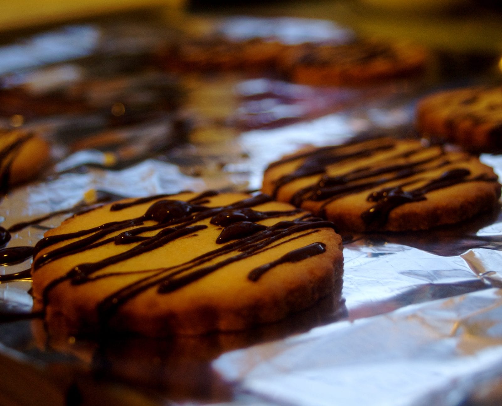 - While cookies are cooling, place chocolate in a heatproof bowl over a pan of simmering water. Stir gently until evenly melted. Using a teaspoon, drizzle melted chocolate over cooled cookies and allow to harden before moving.