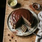 Thin chocolate crêpes layered with pistachio cream and finished with a rich chocolate ganache. A decadent dessert perfect for any occasion.